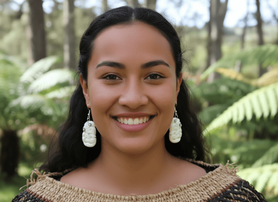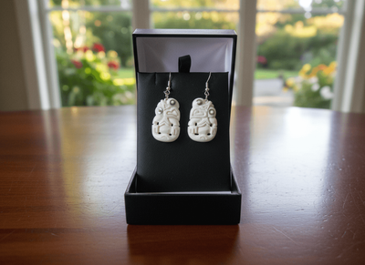 The bone Tiki earrings are brought to life by Paua shell eyes, shimmering with flashes of blue, green, and violet. Set into the warm, natural bone, the iridescence of the paua shell creates a beautiful contrast—earthy and oceanic in the same breath. As the light moves, the eyes seem to shift and glow, giving each tiki a watchful, almost protective presence.