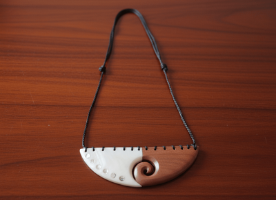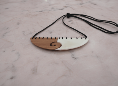 Bone, wood and Pāua shell Whakangungu (shield) necklace