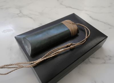 Your Taonga (treasure) is presented in a black leather‑bound box with a matching black leather pad, making it ideal for gifting or safekeeping.